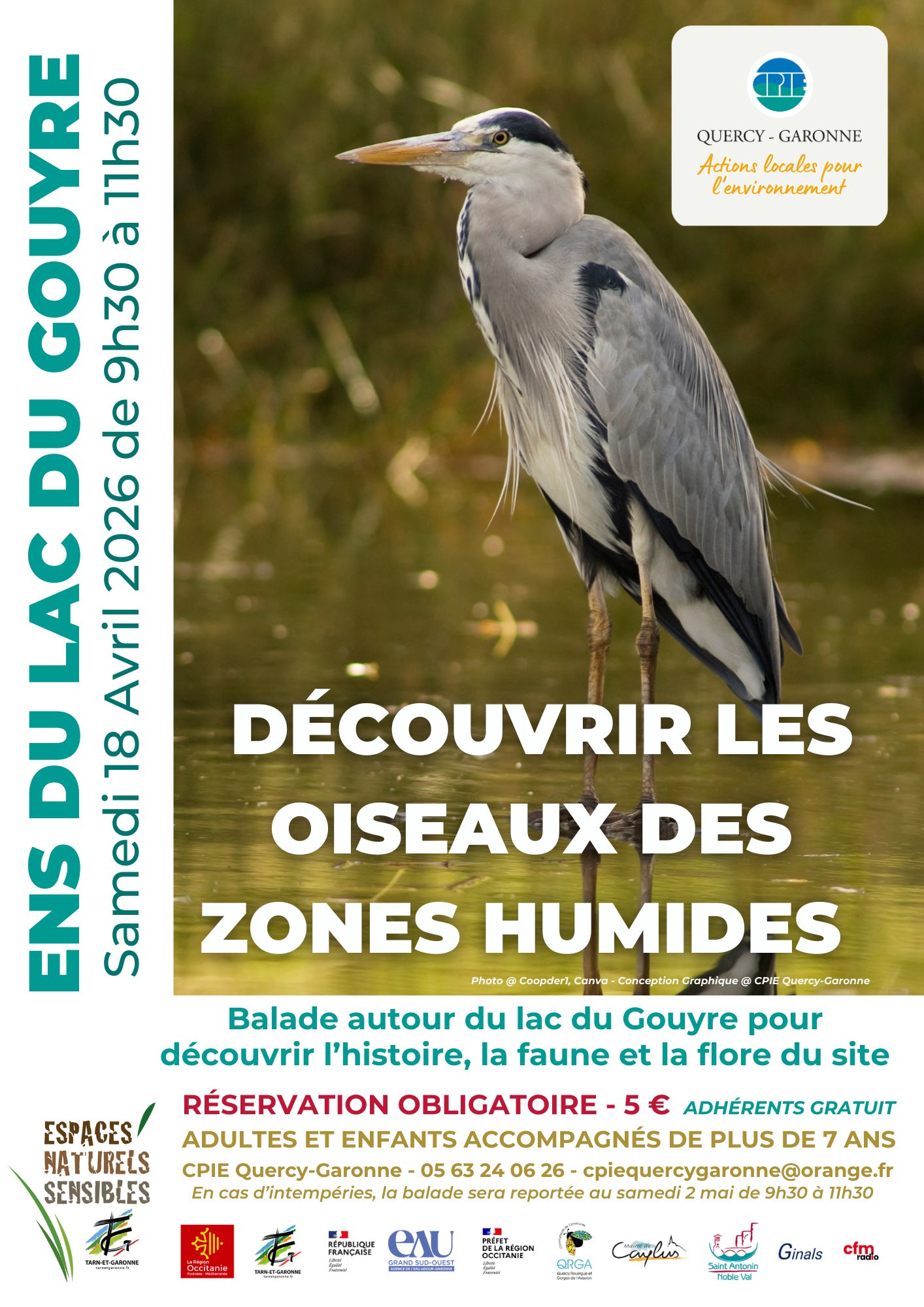 Date de l'évènement : 18/04/2026 09:30 - 12:30 Export event Lac du Gouyre - 9h30à 11h30 Réservation ouverte Prévoir appareil photos, chaussures de marche, eau A la découverte des oiseaux des zones humides sur l'ENS du lac du Gouyre Précédent Formation Inventaire Participatif Fritillaire Pintade- Atlas de la Biodiversité des 6 communes associées Suivant Formation Initiation Inventaire participatif "VIGIE TERRE" Print