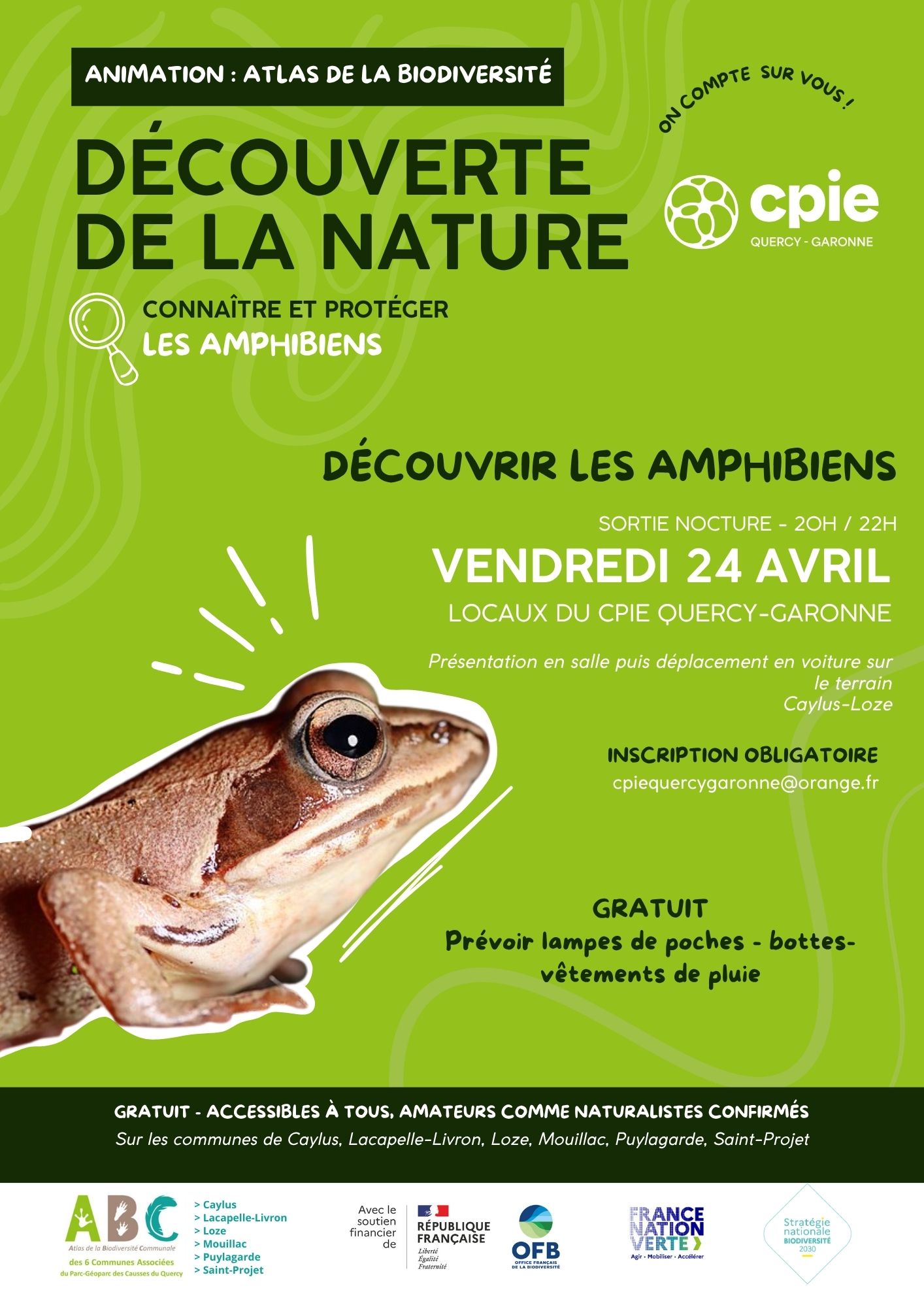 Date de l'évènement : 24/04/2026 20:00 - 22:00 Export event Caylus puis Loze Réservation ouverte Sortie Nocturne amphibiens Précédent Formation Initiation Inventaire participatif "VIGIE TERRE" Suivant Formation Inventaire participatif Lézard Ocellé - première journée Print