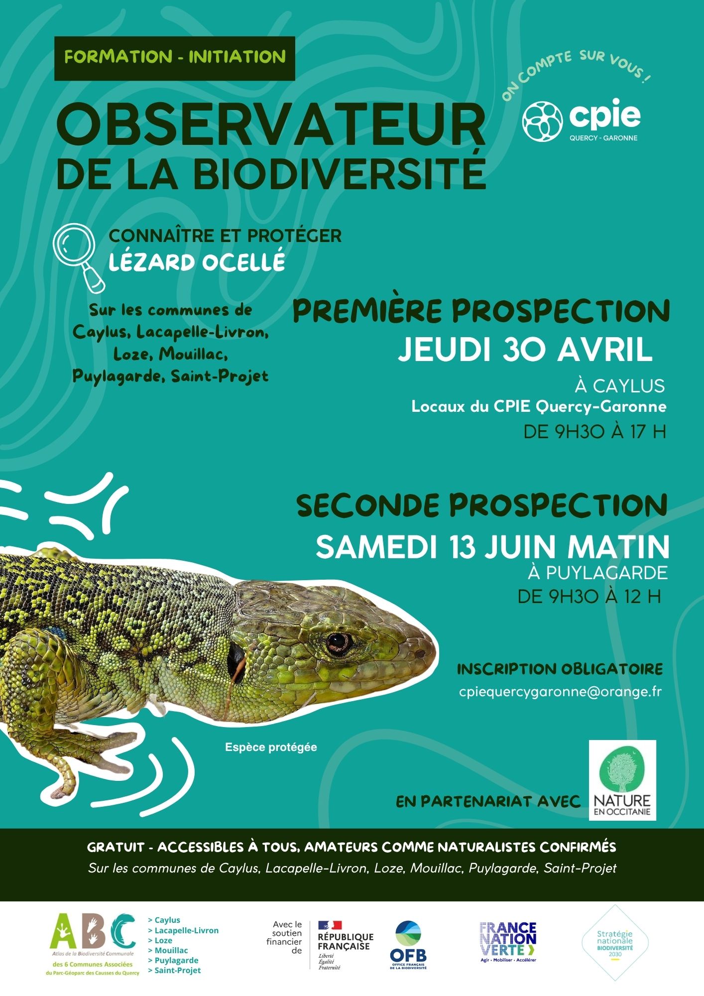 Devenez Observateur Relais de l’inventaire du « Lézard ocellé », participez à la formation qui se tiendra le jeudi 30 avril à Caylus de 9h30 à 17h et qui vous permettra de mieux connaitre l’espèce, son milieu de vie, la méthode d’inventaire.